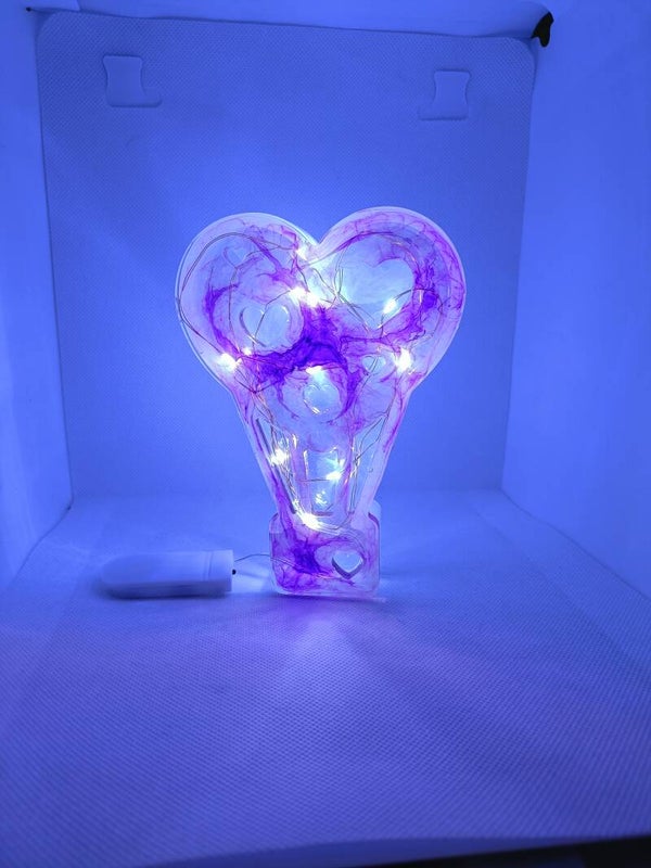 Das Licht hat die Maße L: 14,5cm*B: 10,2cm*H: 2,5cm und besteht aus Epoxidharz und einer LED-Lichterkette im inneren (Kaltweiß).